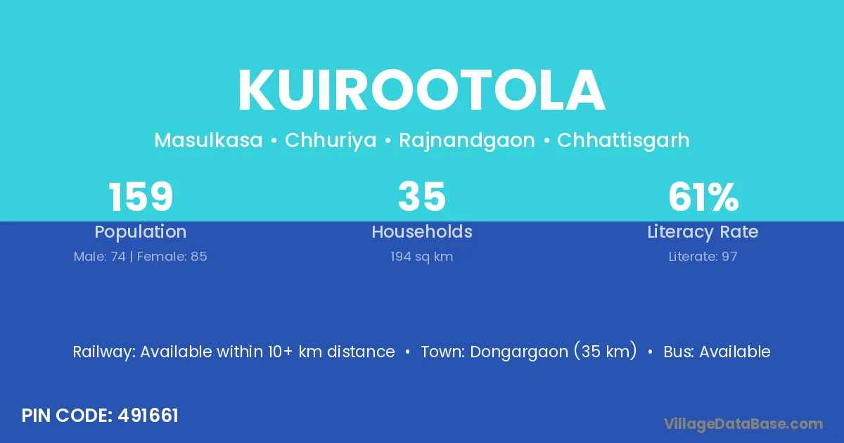 Dongargaon (35 km) is the nearest town to Kuirootola village for major economic activities and is located approximately 35 km away.