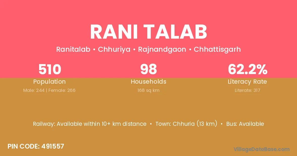 Rani Talab village has a total population of 510 people, of which 244 are males and 266 are females.