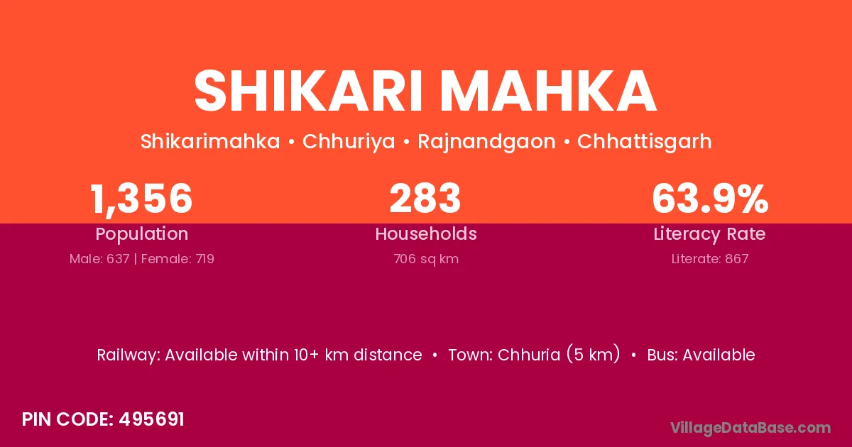 Chhuria (5 km) is the nearest town to Shikari Mahka village for major economic activities and is located approximately 5 km away.