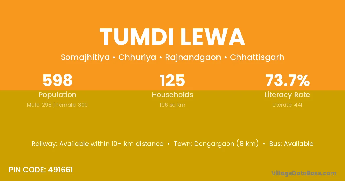 Dongargaon (8 km) is the nearest town to Tumdi Lewa village for major economic activities and is located approximately 8 km away.
