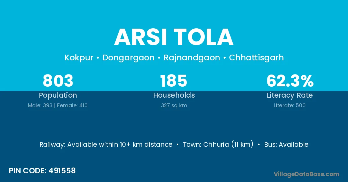 Chhuria (11 km) is the nearest town to Arsi Tola village for major economic activities and is located approximately 11 km away.
