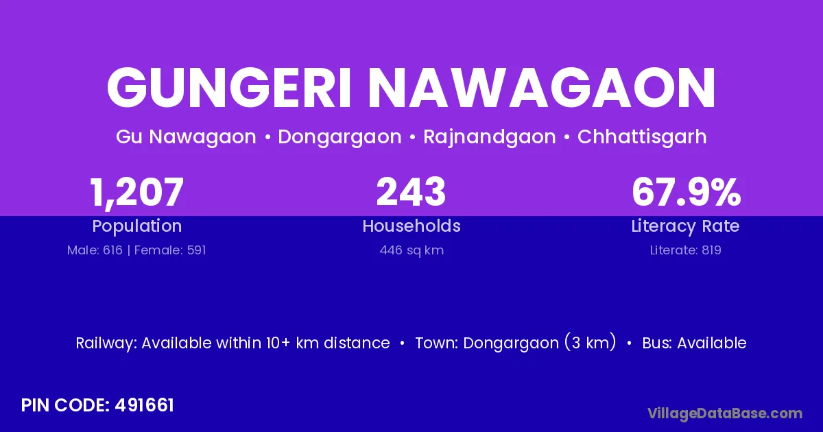 Dongargaon (3 km) is the nearest town to Gungeri Nawagaon village for major economic activities and is located approximately 3 km away.