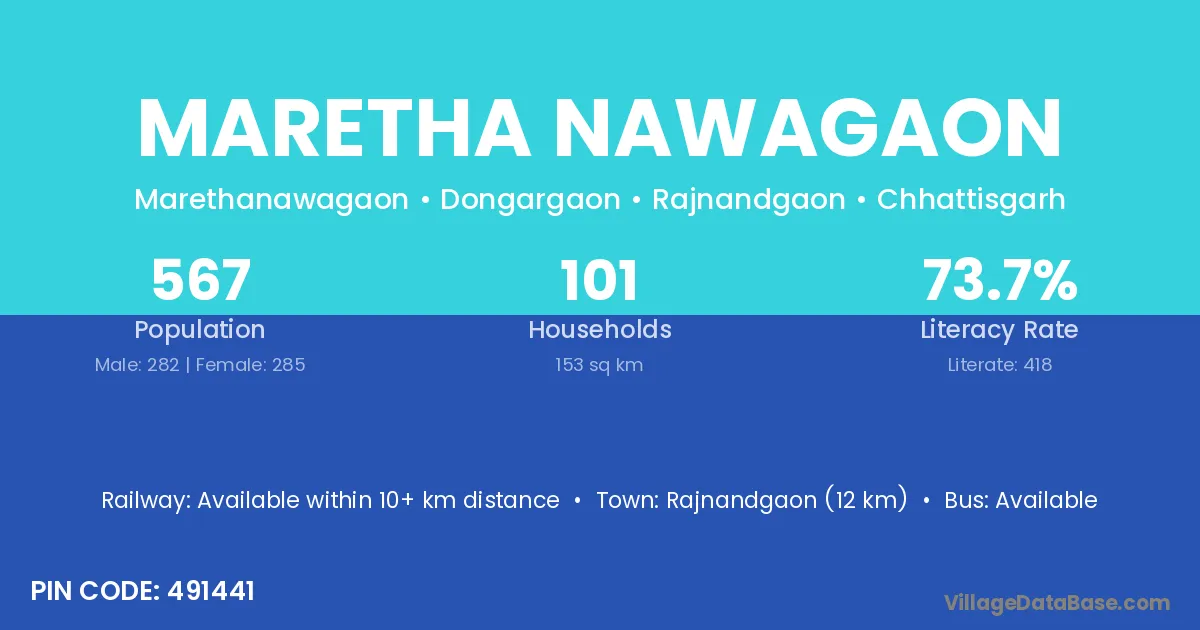 Rajnandgaon (12 km) is the nearest town to Maretha Nawagaon village for major economic activities and is located approximately 12 km away.