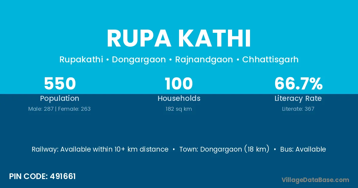 Dongargaon (18 km) is the nearest town to Rupa Kathi village for major economic activities and is located approximately 18 km away.