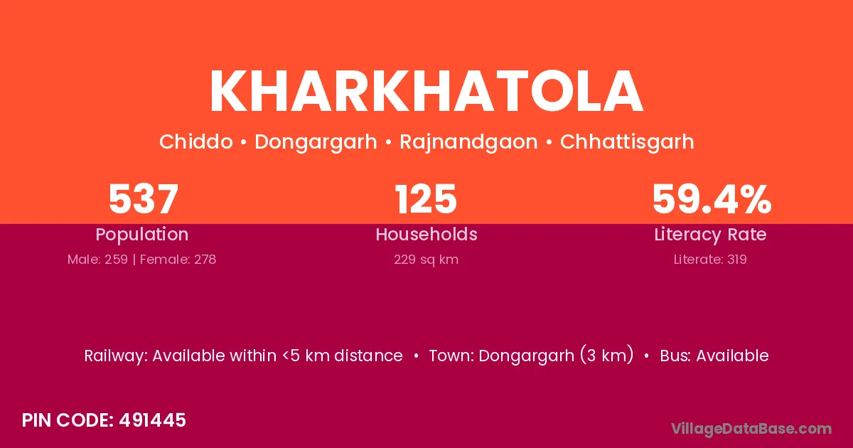 Dongargarh (3 km) is the nearest town to Kharkhatola village for major economic activities and is located approximately 3 km away.