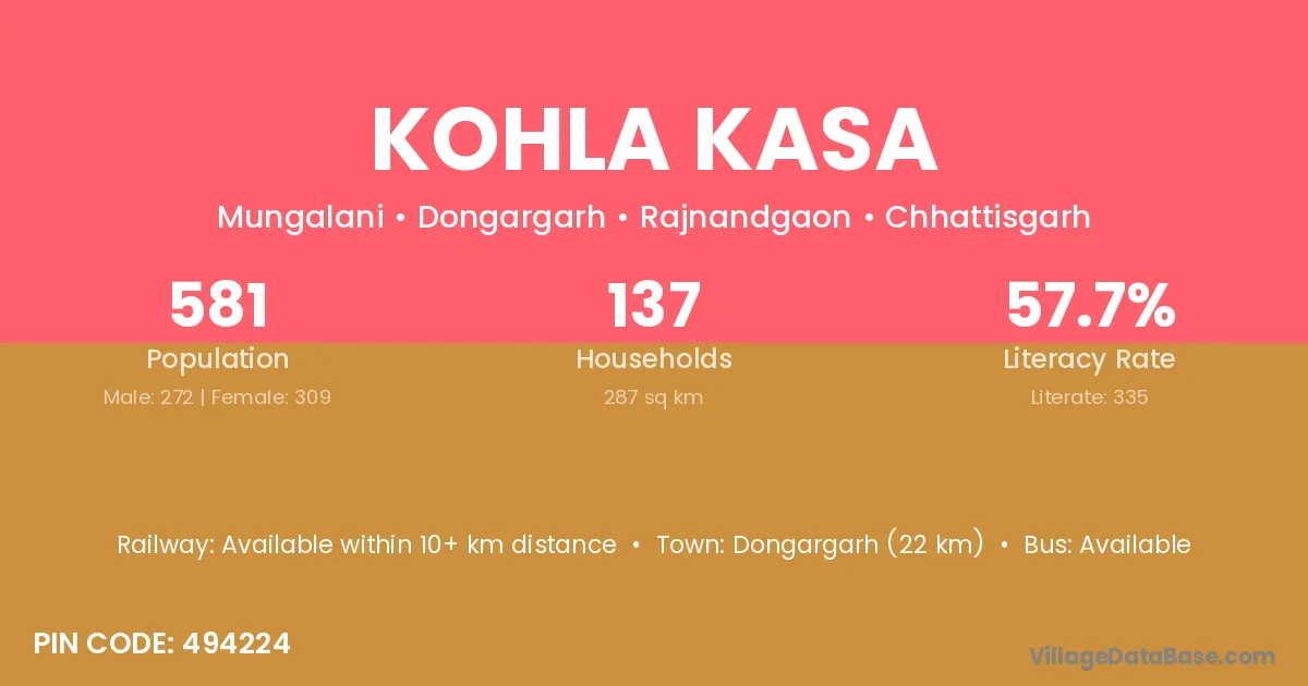 Dongargarh (22 km) is the nearest town to Kohla Kasa village for major economic activities and is located approximately 22 km away.