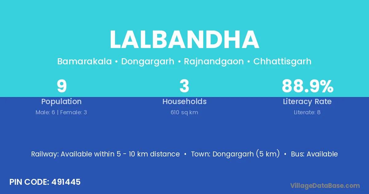 Dongargarh (5 km) is the nearest town to Lalbandha village for major economic activities and is located approximately 5 km away.