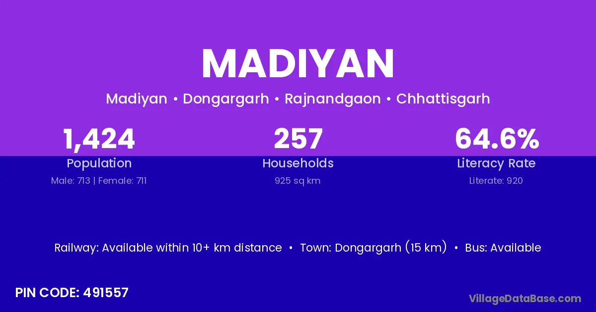Dongargarh (15 km) is the nearest town to Madiyan village for major economic activities and is located approximately 15 km away.