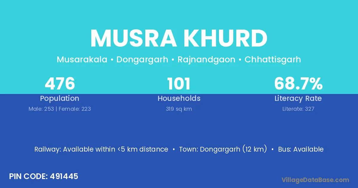 Dongargarh (12 km) is the nearest town to Musra Khurd village for major economic activities and is located approximately 12 km away.