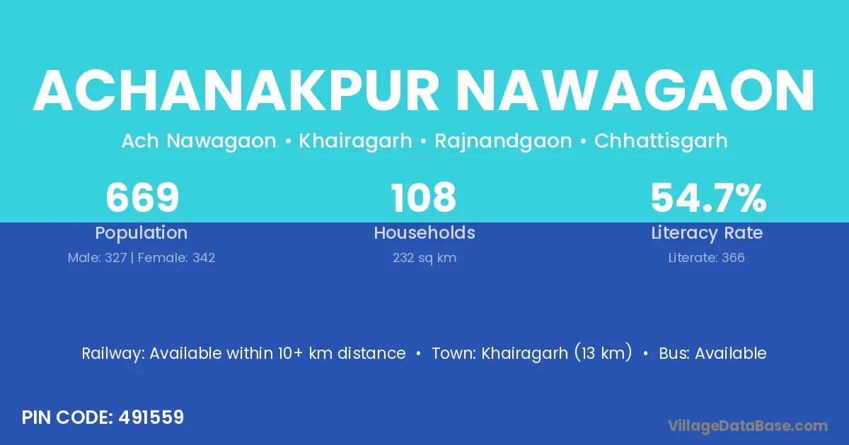 Khairagarh (13 km) is the nearest town to Achanakpur Nawagaon village for major economic activities and is located approximately 13 km away.