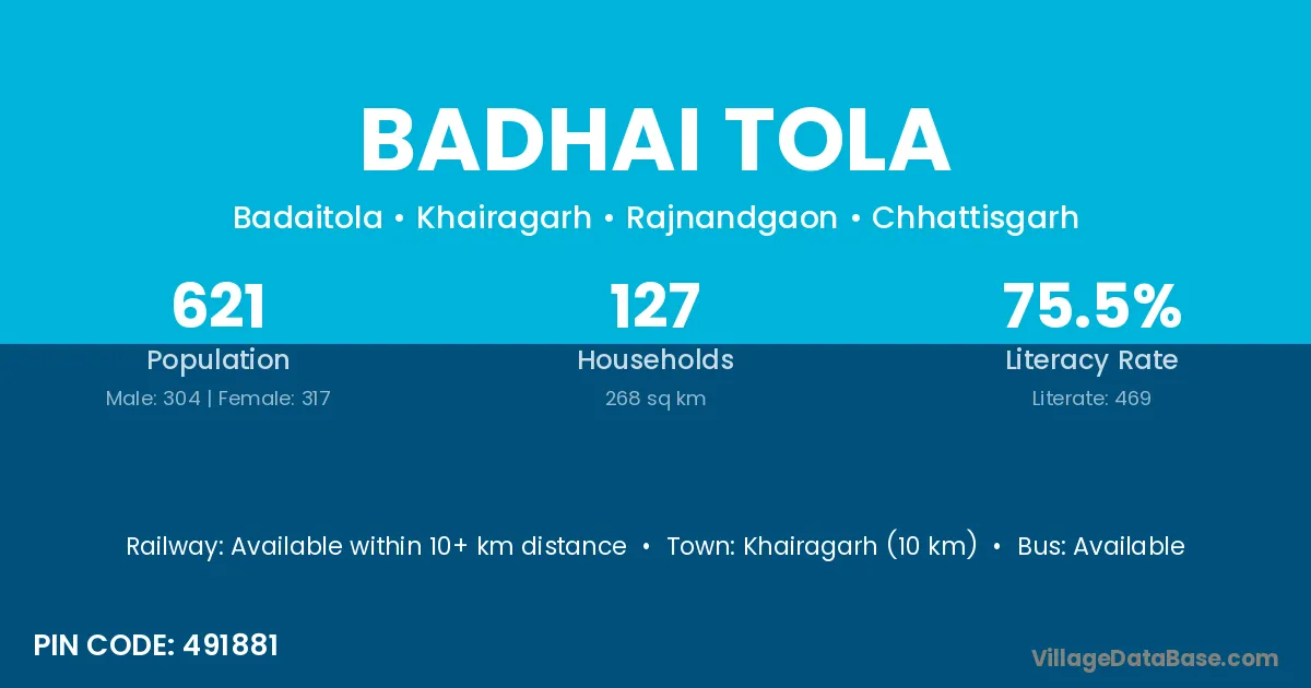 Khairagarh (10 km) is the nearest town to Badhai Tola village for major economic activities and is located approximately 10 km away.