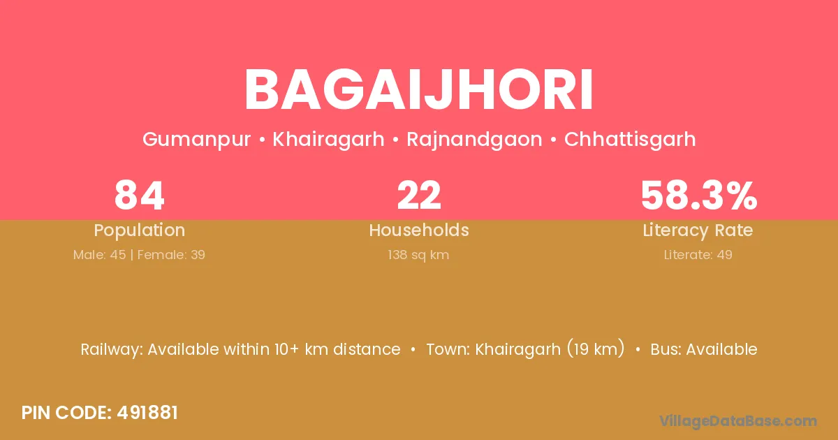 Khairagarh (19 km) is the nearest town to Bagaijhori village for major economic activities and is located approximately 19 km away.