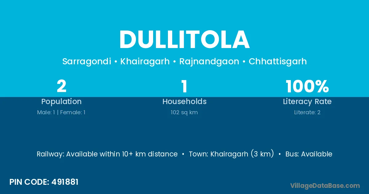 Khairagarh (3 km) is the nearest town to Dullitola village for major economic activities and is located approximately 3 km away.