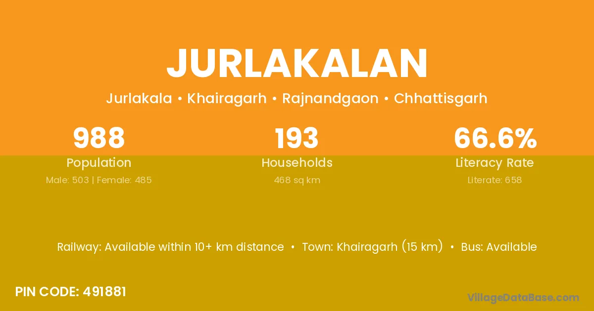 Khairagarh (15 km) is the nearest town to Jurlakalan village for major economic activities and is located approximately 15 km away.