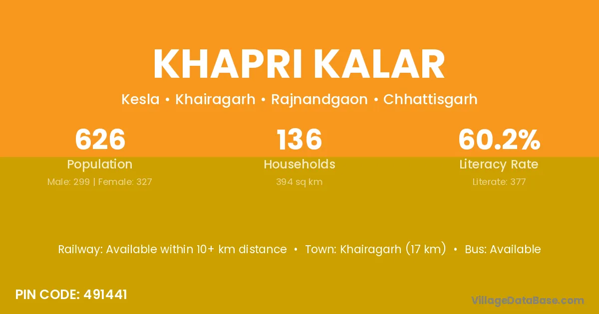 Khairagarh (17 km) is the nearest town to Khapri Kalar village for major economic activities and is located approximately 17 km away.
