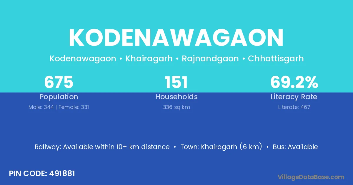 Khairagarh (6 km) is the nearest town to Kodenawagaon village for major economic activities and is located approximately 6 km away.