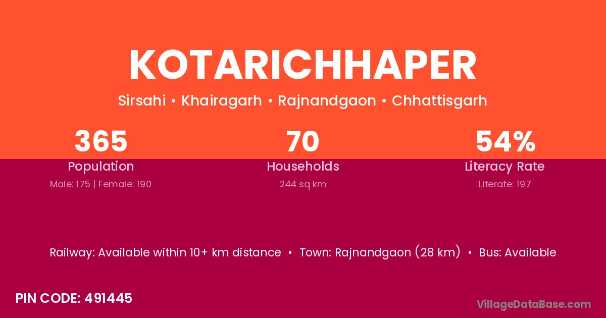Rajnandgaon (28 km) is the nearest town to Kotarichhaper village for major economic activities and is located approximately 28 km away.