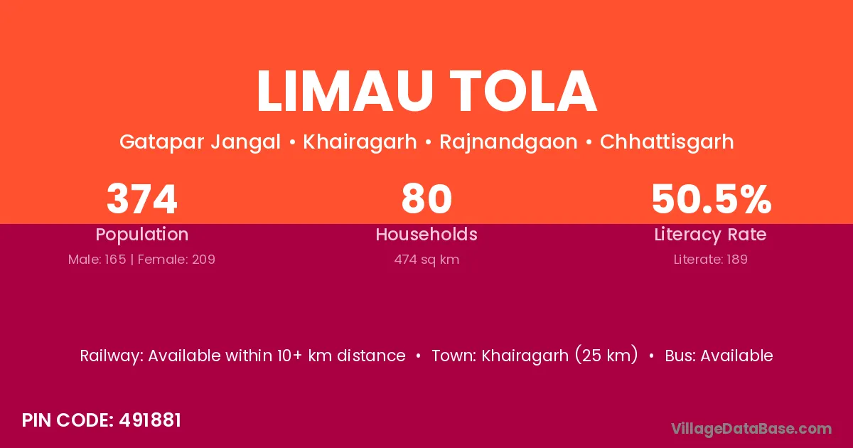 Khairagarh (25 km) is the nearest town to Limau Tola village for major economic activities and is located approximately 25 km away.