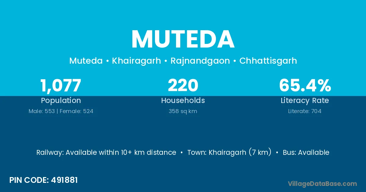 Khairagarh (7 km) is the nearest town to Muteda village for major economic activities and is located approximately 7 km away.