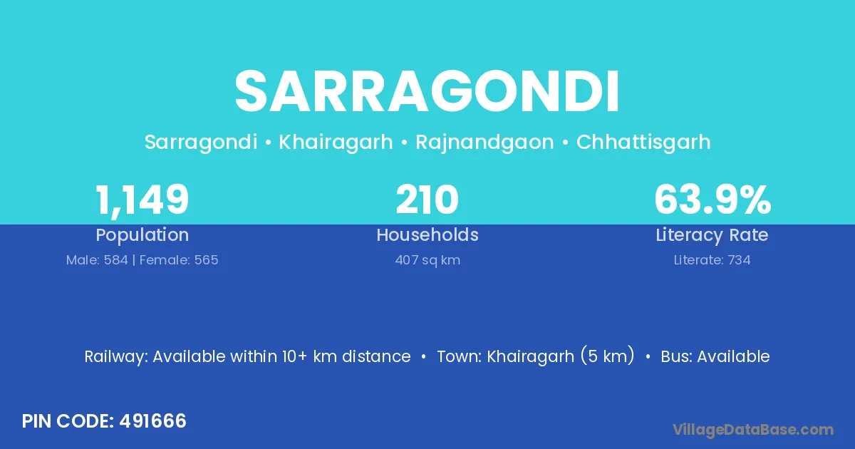 Khairagarh (5 km) is the nearest town to Sarragondi village for major economic activities and is located approximately 5 km away.
