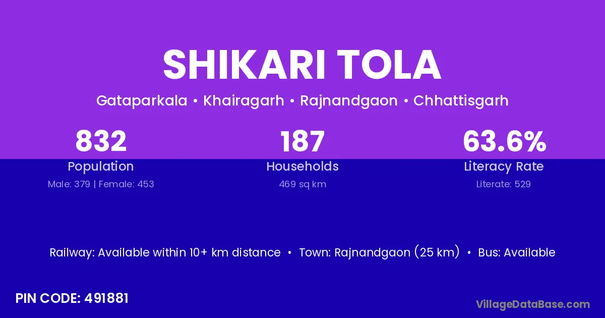 Rajnandgaon (25 km) is the nearest town to Shikari Tola village for major economic activities and is located approximately 25 km away.
