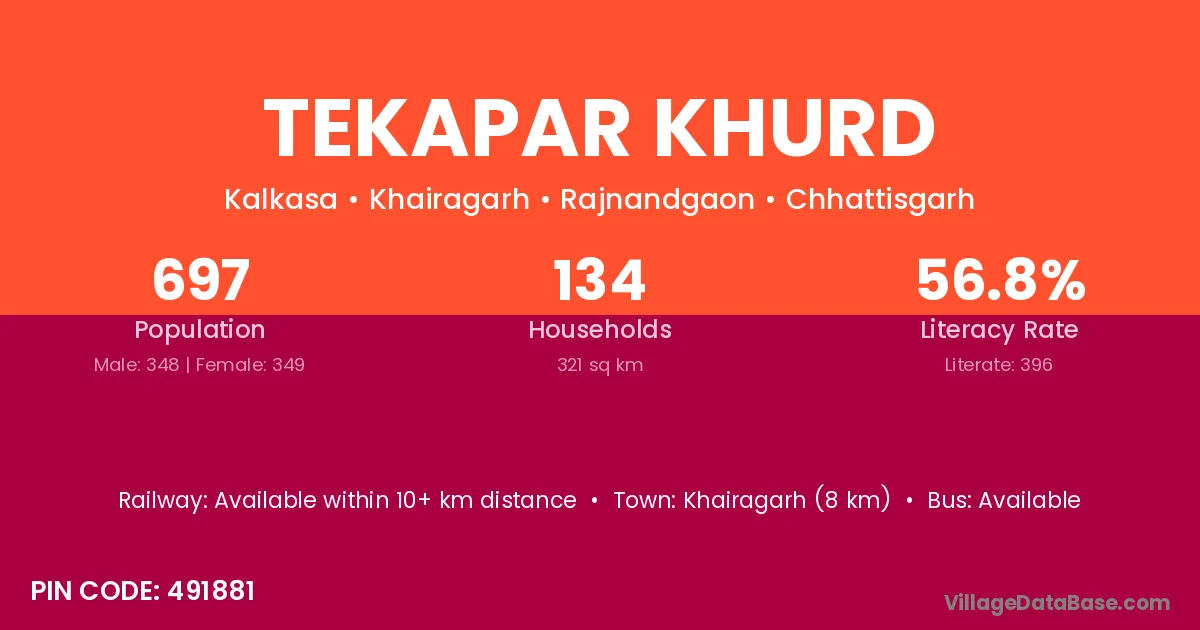 Khairagarh (8 km) is the nearest town to Tekapar Khurd village for major economic activities and is located approximately 8 km away.