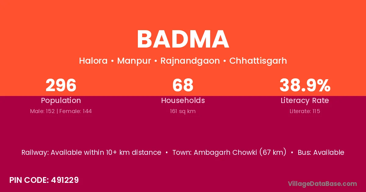 Ambagarh Chowki (67 km) is the nearest town to Badma village for major economic activities and is located approximately 67 km away.