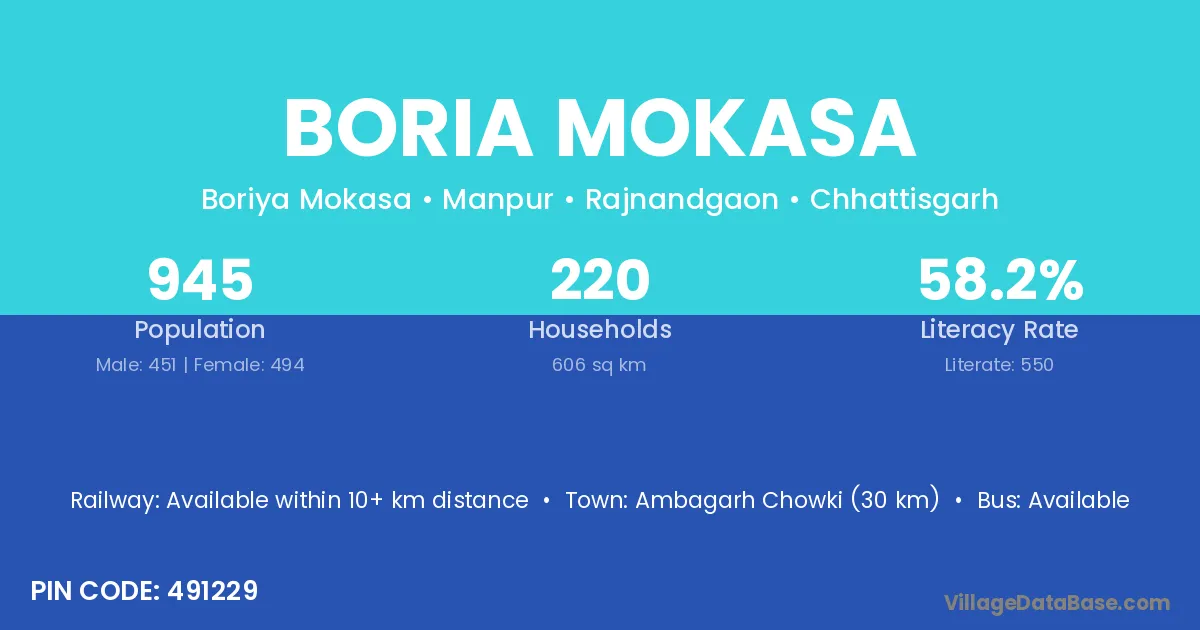 Ambagarh Chowki (30 km) is the nearest town to Boria Mokasa village for major economic activities and is located approximately 30 km away.