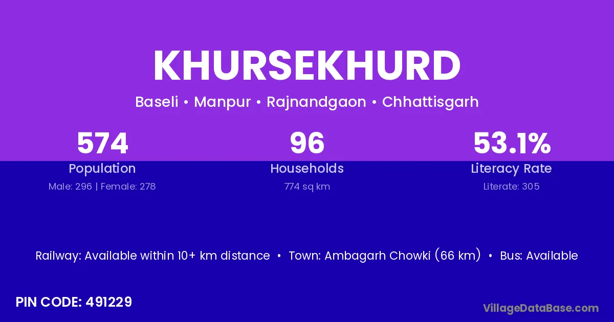 Ambagarh Chowki (66 km) is the nearest town to Khursekhurd village for major economic activities and is located approximately 66 km away.
