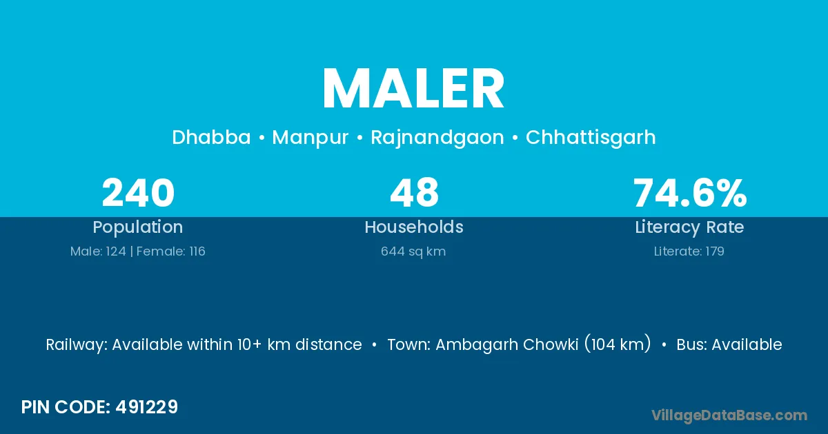 Ambagarh Chowki (104 km) is the nearest town to Maler village for major economic activities and is located approximately 104 km away.