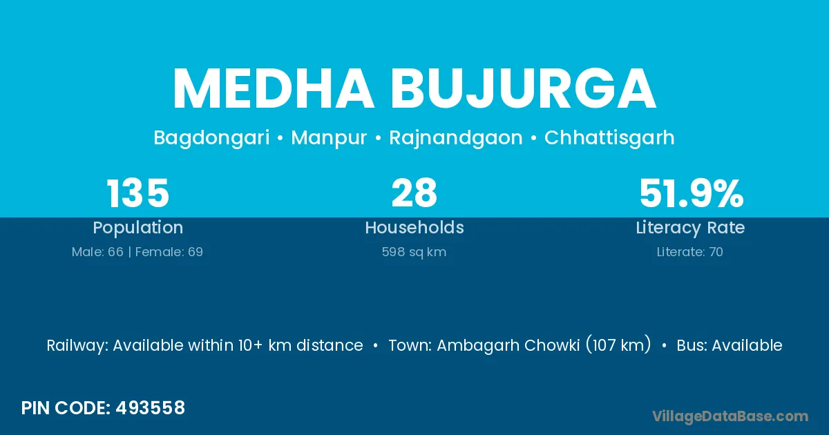 Ambagarh Chowki (107 km) is the nearest town to Medha Bujurga village for major economic activities and is located approximately 107 km away.