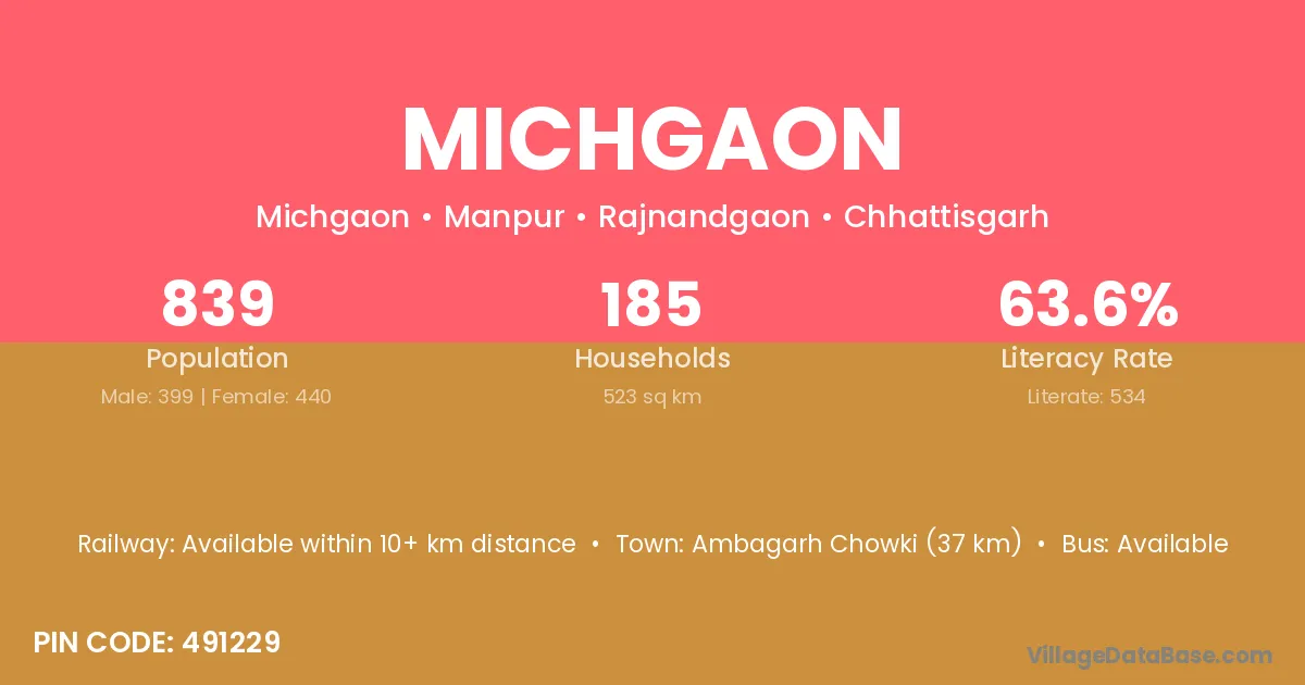 Ambagarh Chowki (37 km) is the nearest town to Michgaon village for major economic activities and is located approximately 37 km away.