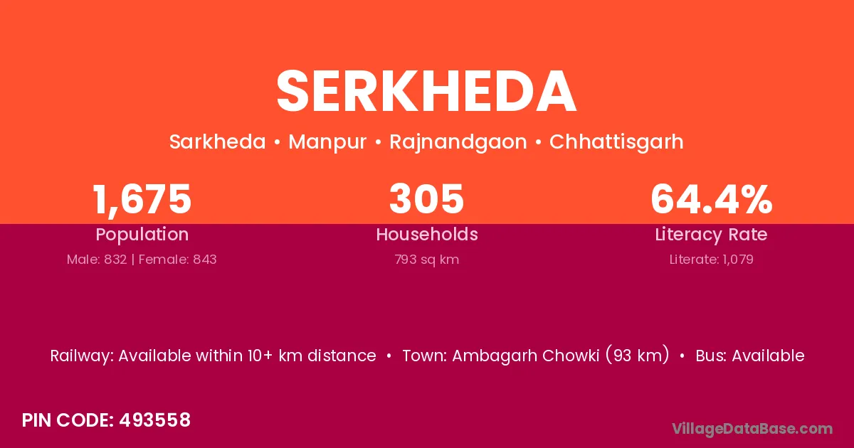 Ambagarh Chowki (93 km) is the nearest town to Serkheda village for major economic activities and is located approximately 93 km away.