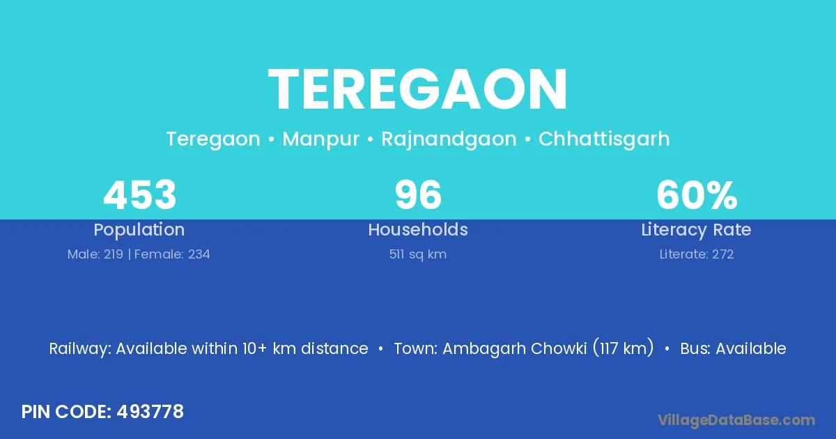 Ambagarh Chowki (117 km) is the nearest town to Teregaon village for major economic activities and is located approximately 117 km away.