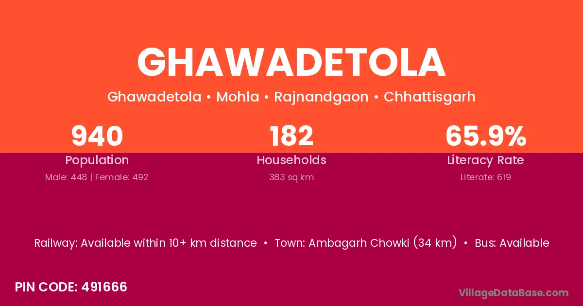 Ambagarh Chowki (34 km) is the nearest town to Ghawadetola village for major economic activities and is located approximately 34 km away.