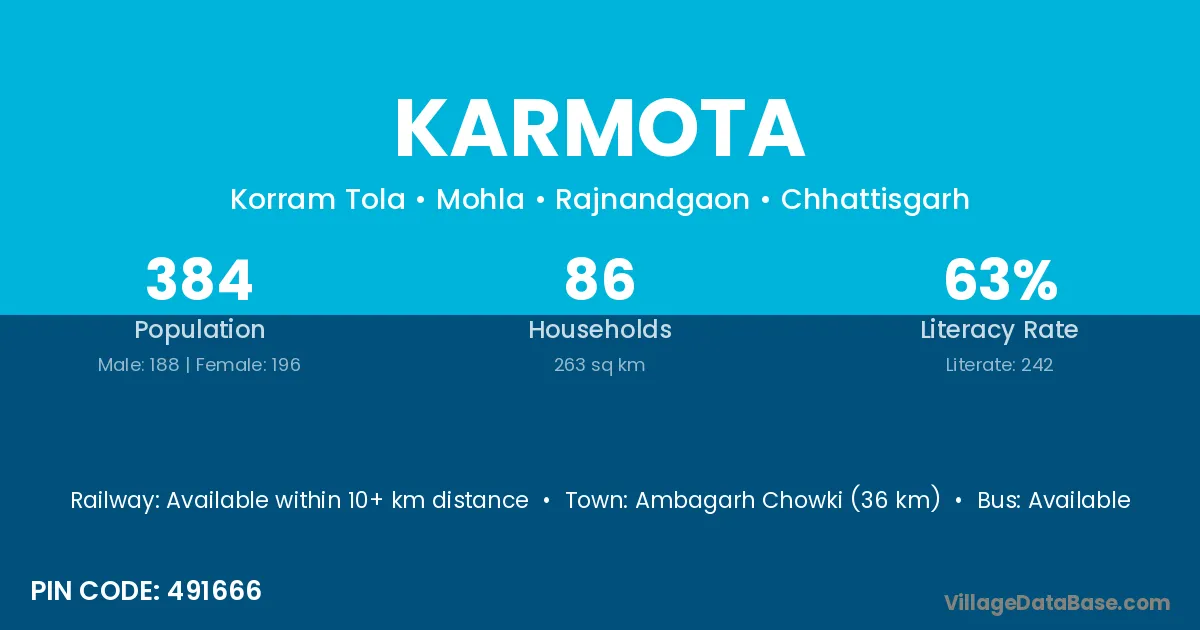 Ambagarh Chowki (36 km) is the nearest town to Karmota village for major economic activities and is located approximately 36 km away.