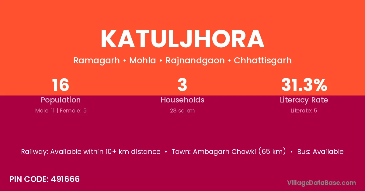 Ambagarh Chowki (65 km) is the nearest town to Katuljhora village for major economic activities and is located approximately 65 km away.