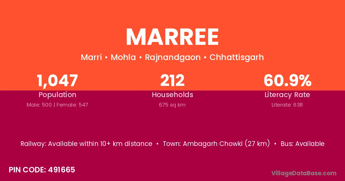 Ambagarh Chowki (27 km) is the nearest town to Marree village for major economic activities and is located approximately 27 km away.