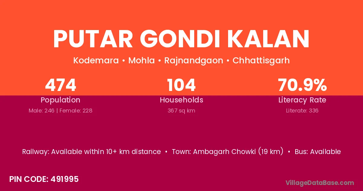 Putar Gondi Kalan village has a total population of 474 people, of which 246 are males and 228 are females.