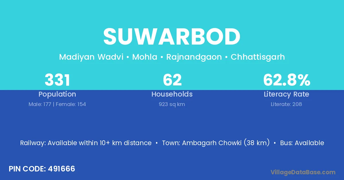 Ambagarh Chowki (38 km) is the nearest town to Suwarbod village for major economic activities and is located approximately 38 km away.