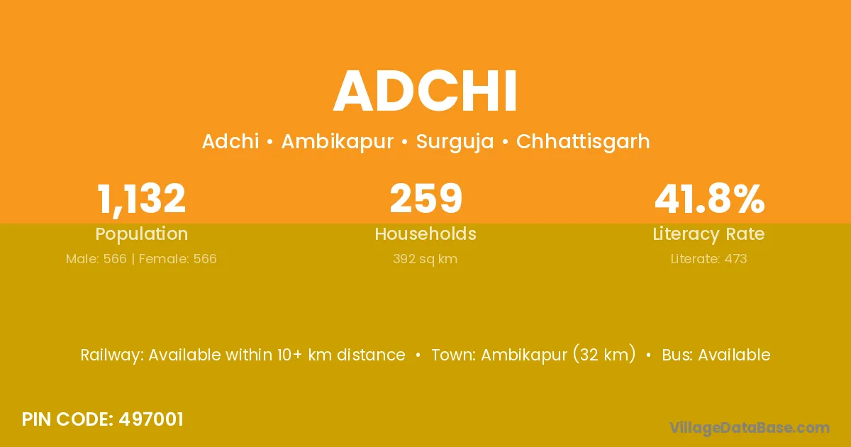 Ambikapur (32 km) is the nearest town to Adchi village for major economic activities and is located approximately 32 km away.