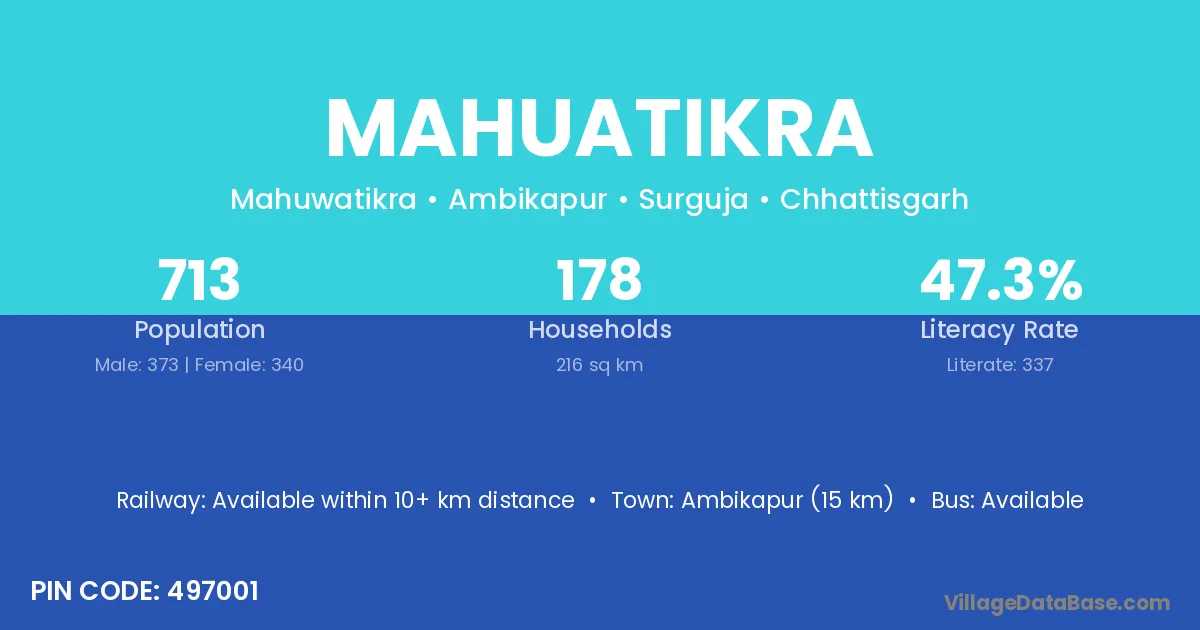 Ambikapur (15 km) is the nearest town to Mahuatikra village for major economic activities and is located approximately 15 km away.