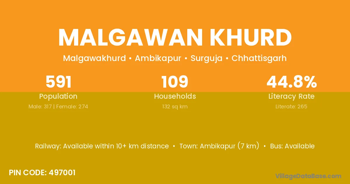 Ambikapur (7 km) is the nearest town to Malgawan Khurd village for major economic activities and is located approximately 7 km away.