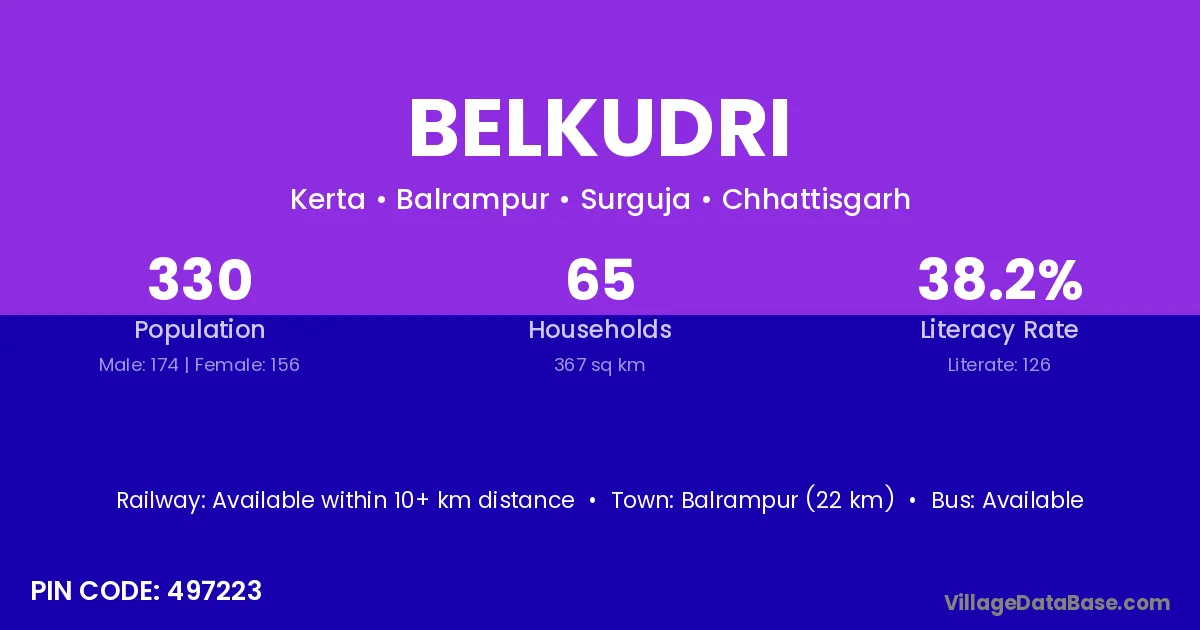 Balrampur (22 km) is the nearest town to Belkudri village for major economic activities and is located approximately 22 km away.