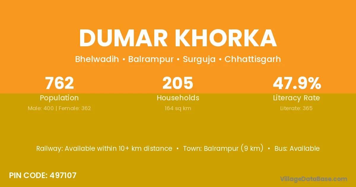 Balrampur (9 km) is the nearest town to Dumar Khorka village for major economic activities and is located approximately 9 km away.