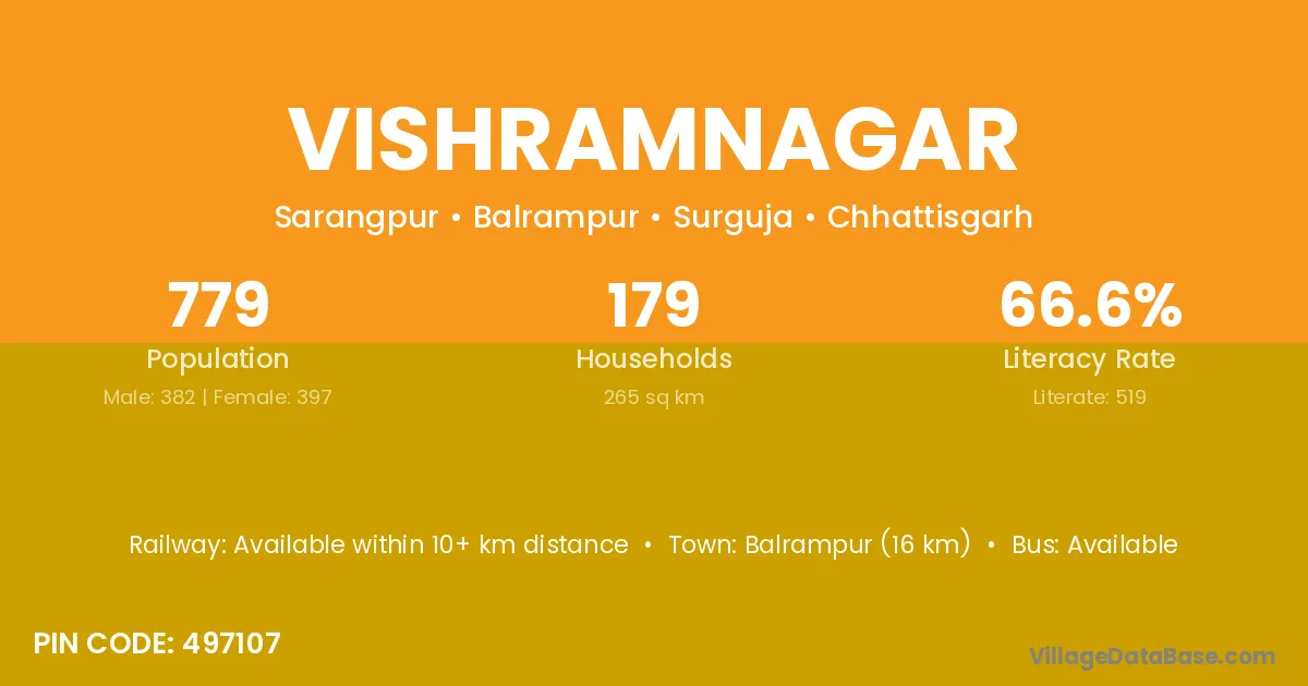 Vishramnagar village has a total population of 779 people, of which 382 are males and 397 are females.