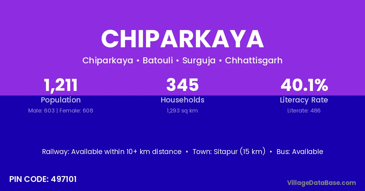 Chiparkaya village has a total population of 1,211 people, of which 603 are males and 608 are females.