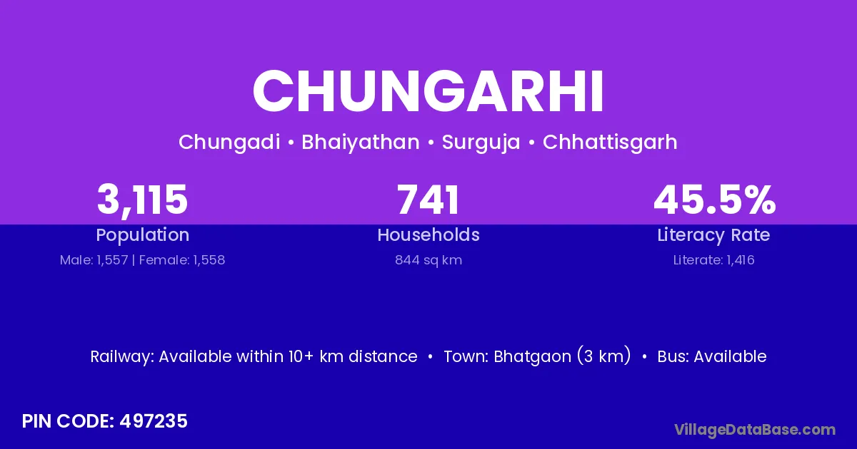 Chungarhi village has a total population of 3,115 people, of which 1,557 are males and 1,558 are females.
