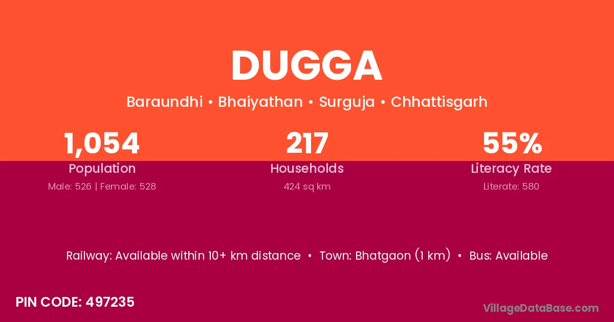 Dugga village has a total population of 1,054 people, of which 526 are males and 528 are females.