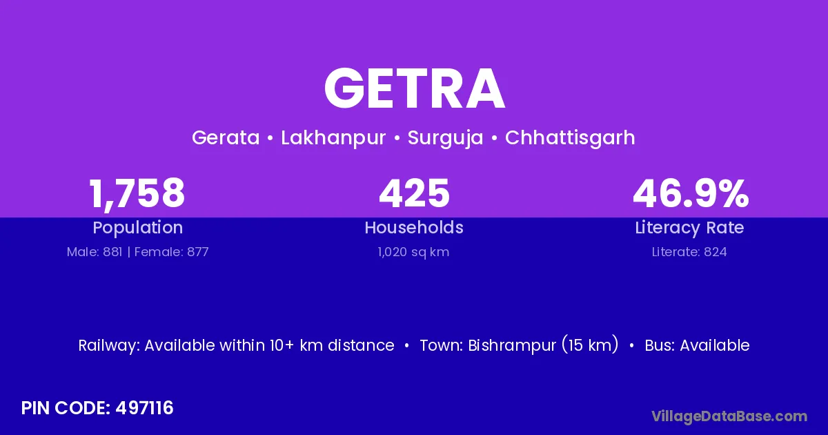 Bishrampur (15 km) is the nearest town to Getra village for major economic activities and is located approximately 15 km away.